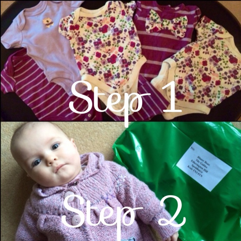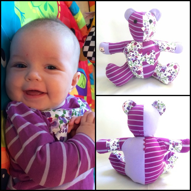 As we always do we sent them a pre addressed envelope and check list and eagerly awaited the special clothing. The keepsake bear was to be made from precious much loved first baby clothes. Lucy’s daughter (the cutest little model) always looked so sweet in purple clothing and the items that arrived were the prettiest outfits. There was a mixture of floral, stripes and plain including a little bear logo.