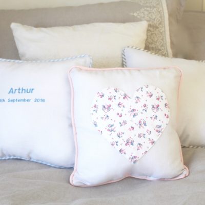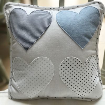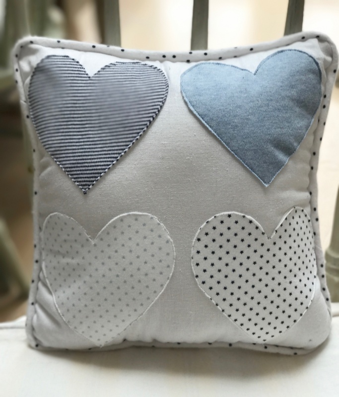 The cushions are hand made from 100% washed linen and display hearts made from a precious babygro. Measuring 10” square, they are piped in coordinated fabric, with the option of embroidery on the back. Depending on how many outfits are available, we can create a cushion with 1 or 4 small hearts. The one heart option still allows customers to create a special keepsake even if they just have one outfit. Any size outfit is fine however small and we also promise to return any unused items if wished.