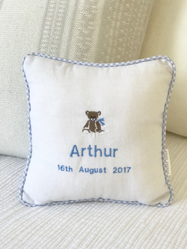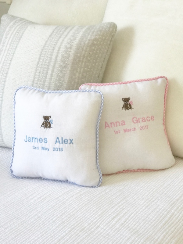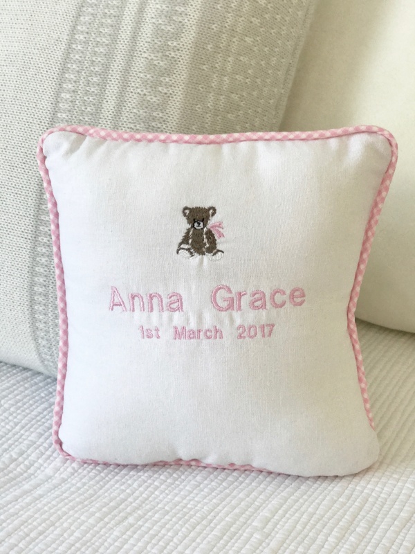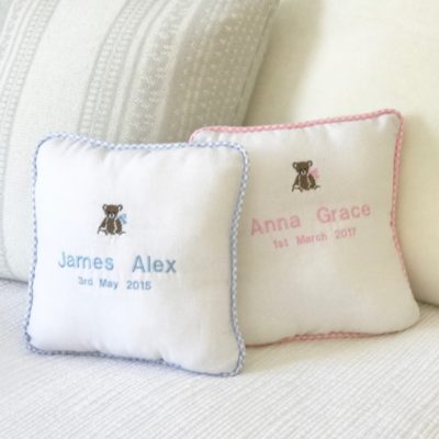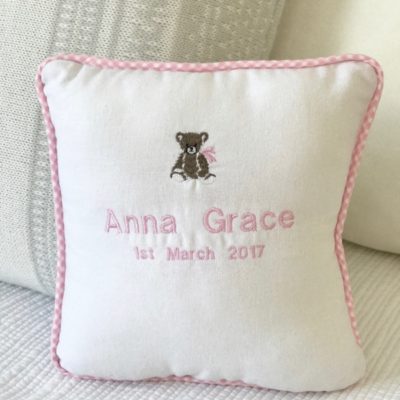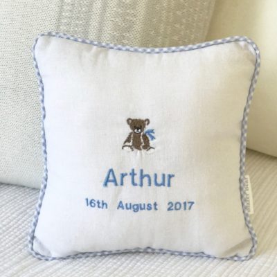 Our handmade newborn gift cushions have been extremely popular as gifts for new parents. They are a thoughtful and beautiful way to celebrate the birth of a little one. Again made from 100% washed linen, there are three different colour way options in powder pink, powder blue or soft grey. The cushions are embroidered with a little bear also with a coordinating bow and the baby’s name and date of birth.
