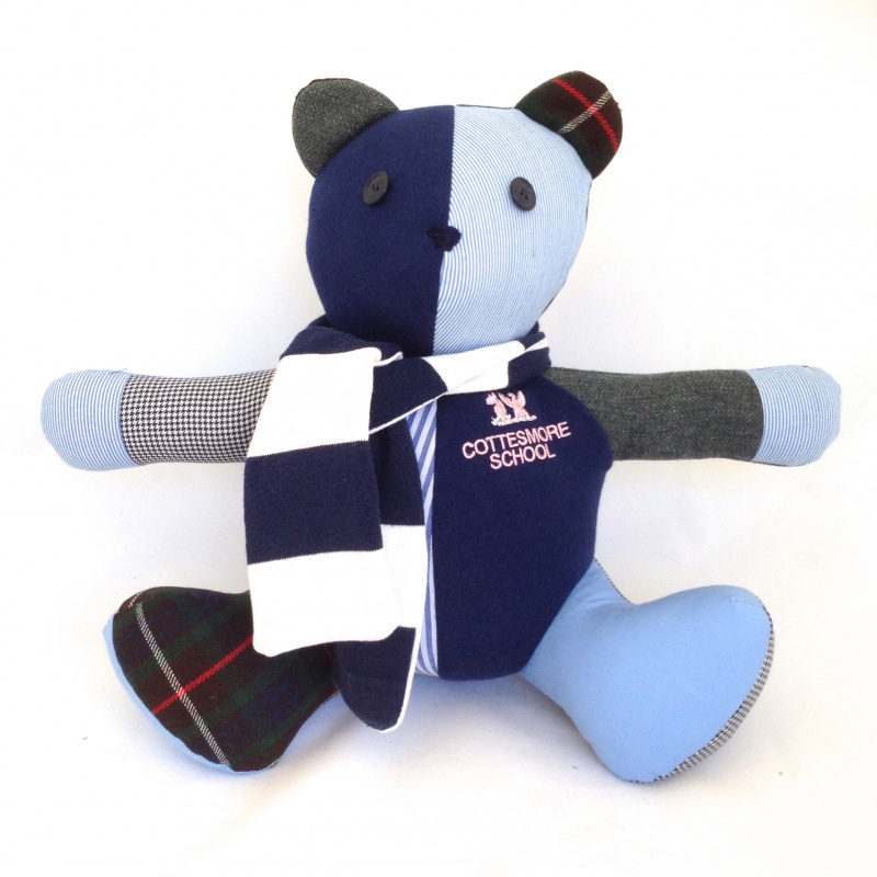 Cottesmore School also sent us a selection of material from different parts of their uniform. We combined them all to make a wonderful patchwork bear which had so many memories. The tartan, dogtooth material, blazer, shirt, sweatshirt were all incorporated in to a fantastic keepsake. The sports top again made a wonderful scarf in blue and white stripes. We were delighted to hear the school loved it!