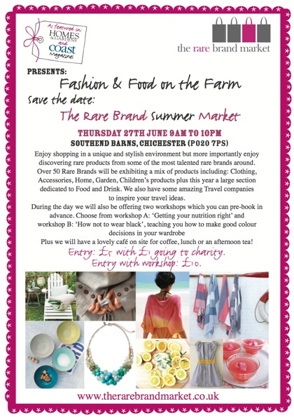 On Thursday we are attending another fantastic fair The Rare Brands Market. It is part of the events laid on to coincide with the Chichester Festival. The Fair is set at the beautiful Southend Barns. Owned by William and Mariella Fleming, who are passionate about environmentally friendly farming, the barns are set in beautiful countryside and are a stunning and unique new wedding venue near Chichester. Spend a day with friends and shop in beautiful surroundings and viewing new and exciting brands you would not yet see on the high street. The cafe is run by Field and Fork, delicious food from seasonal and local produce. The restaurant is situated in the beautiful Pallant House Chichester but also produces wonderful menus for private events and parties. So come and see us and don’t forget we are offering a 10% discount on the day!